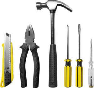 Set de herramientas en estuche con cierre. Contiene 7 piezas: Cuter, pinza alicate, martillo, 3 destornilladores de diferentes puntas: punta plana chico, punta plana grande y punta phillips y llave allen.
