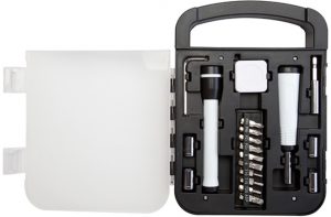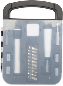 De 19 piezas. Contiene: linterna, cinta metrica, multi desarmador con juego de 10 puntas 4 phillips, 2 planas, 3 hexagonales y 1 adaptador para acople. Acople para llave tubo 7, 8 , 9 y 10 mm y llave allen.
