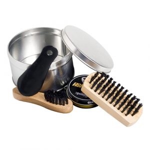 Incluye 4 piezas: cera color neutro, 2 cepillos y calzador. Con estuche redondo metálico.