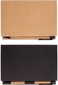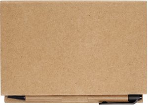 Incluye: block de hojas blancas, regla plástica transparente, 5 señaladores de colores, post-it, bolígrafo de cartón con punta, clip y pulsador de plástico negro.