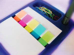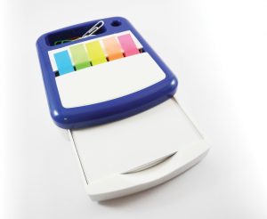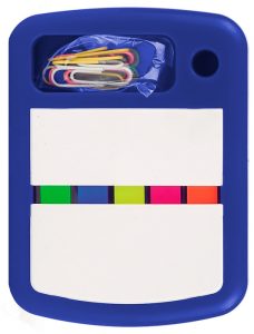 Incluye block de hojas blancas. Dispensador de banderitas de 5 colores diferentes. Compartimento para clips (incluidos). Porta lápiz.