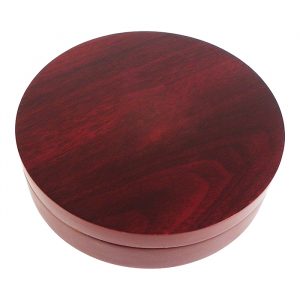 Set para vino en caja de madera redonda, con 4 piezas; saca corchos (con navaja y destapador), vertedor de vino, tapón corta gota y aro anti goteo.