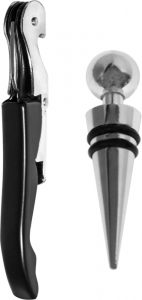 Fabricado en metal. Incluye sacacorcho y tapón en metal. Estuche de cartón.