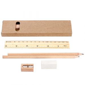 Incluye: goma, 2 lápices, regla y sacapuntas de madera.
