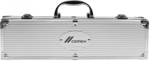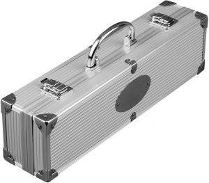 Set de 3 piezas: cuchillo parrillero, tenedor parrillero y pinza. Caja contenedora de aluminio con manija para transportar. Apertura completa. Cierres metálicos. Plaqueta para grabado.