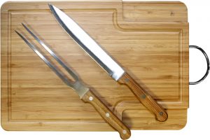 Set de BBQ de tabla con manija, cuchillo y tenedor asador.