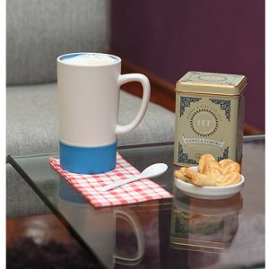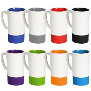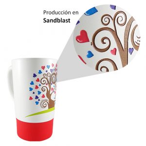 Fabricada en cerámica con manga de silicón. Disponible en colores azul, azul claro, morado, rojo, verde, negro, gris y naranja. Presentación en caja individual.