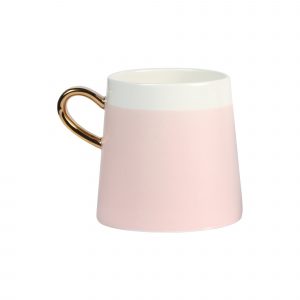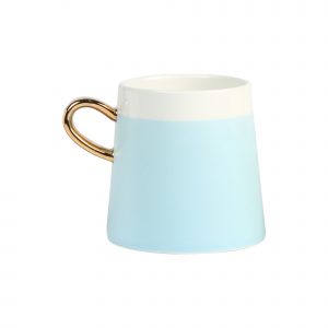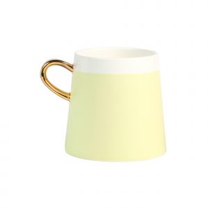 Taza fabricada en cerámica con asa en terminado dorado, capacidad 360 ml.