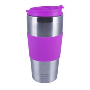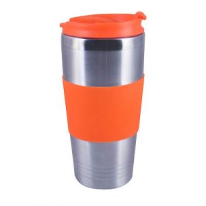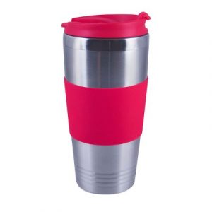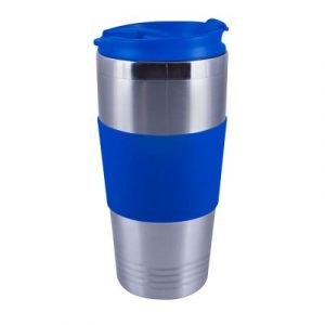 Termo con doble pared de acero inoxidable y grip de silicón con capacidad de 450 ml. Tapa de rosca.