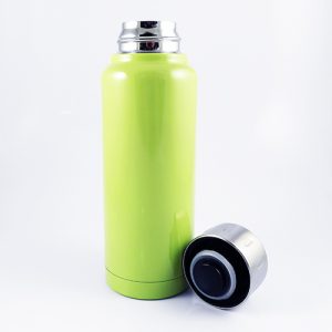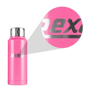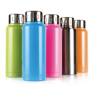 De acero inoxidable y tapa de polipropileno aislada para conservar la temperatura. Disponible en colores plata, azul, naranja, verde y rosa.