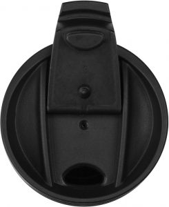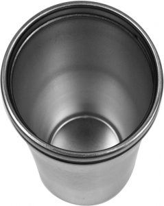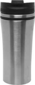 Fabricado en acero inoxidable y plástico. Doble pared metálica. Base de goma antideslizante. Tapa plástica a rosca de plástico con cierre anti derrame.