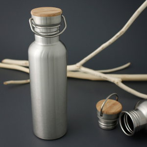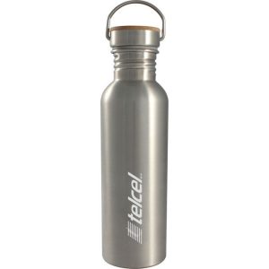 De acero Inoxidable 750 ml. Tapa de acero con cierre de rosca y detalle en bamboo. Práctica agarradera móvil en tapa para transportarlo.