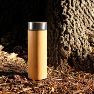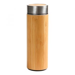 Cilindro fabricado en acero inoxidable y bamboo con tapa metálica, capacidad 420 ml.