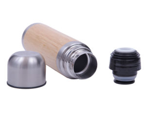 Termo de doble pared de acero inoxidable con exterior de bambú. Tapa de rosca que se utiliza como vaso. CAP. 450 ml.