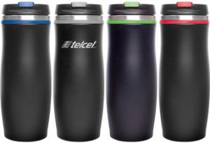 De acero inoxidable y plástico. Diseño de doble pared. Superficie exterior térmica. Mantiene la temperatura del interior. Irrompible.