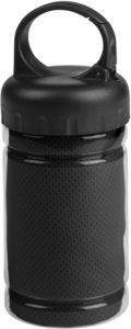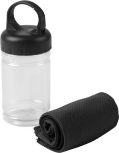Toalla de enfriamiento en un estuche de plástico transparente. Para un efecto refrescante humedezca la toalla con agua o agregue agua en el cilindro e incorpore la toalla. Tapa a rosca con mosquetón.