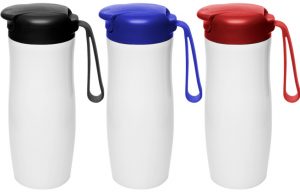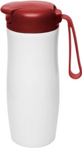 Acero inoxidable y plástico. Térmico de doble pared. Tapa plástica de rosca. Lazo engomado. Irrompible. Base antideslizante.